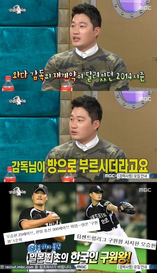 이날 MC들은 2014년 경질설에 시달렸던 한신 와다감독이 오승환의 활약 덕분에 재계약에 성공했다고 설명했다.