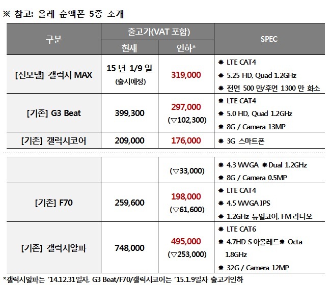 또한, 초슬림/초경량을 자랑하는 ‘갤럭시알파’는 기존 출고가의 3분의 2 수준인 49만 5000원이며, 국내 제조사 LTE 단말 중 최저 출고가를 자랑하는 ‘F70’과 3G 스마트폰의 스테디셀러인 ‘갤럭시코어’ 모두, 20만원도 안 되는 저렴한 가격으로 출고가를 낮췄다. G3의 프리미엄 기능을 합리적인 가격에 제공하는 ‘G3 Beat’ 역시 출고가 29만 7000원으로 가입자 부담을 줄였다.