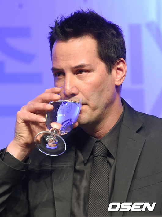 8일 오전 서울 JW메리어트 호텔에서 진행된 영화 '존윅' 키아누 리브스의 공식 기자회견에서 키아누 리브스가 물을 마시고 있다