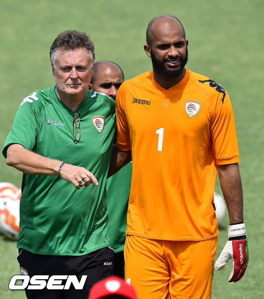 8일 오후 호주 캔버라 맥켈러 파크에서 열린 오만 축구대표팀 훈련때 오만의 골키퍼 알리 알 합시가 코치진들과 즐겁게 얘기를 나누고 있다.