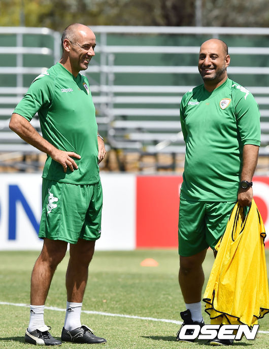 8일 오후 호주 캔버라 맥켈러 파크에서 열린 오만 축구대표팀 훈련때 오만의 폴 르갱 감독이 코치진과 얘기를 나누며 환하게 미소짓고 있다.