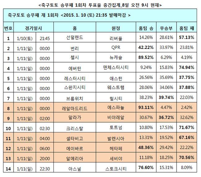 국민체육진흥공단(www.kspo.or.kr)이 발행하는 체육진흥투표권 공식 인터넷 발매사이트 베트맨(www.betman.co.kr)은 오는 10일부터 11일까지 벌어지는 영국 프리미어리그(EPL) 9경기 및 스페인 프리메라리가 5경기 등 총 14경기를 대상으로 한 축구토토 승무패 1회차 투표율 중간집계 결과, EPL 첼시-뉴캐슬(3경기)전에서 국내 축구팬 89.52%가 첼시의 승리를 점쳤다고 밝혔다.