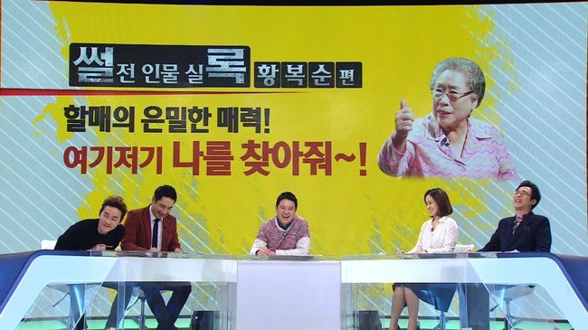 최근 진행된 JTBC ‘썰전’의 예능심판자 코너 녹화에서 팔순이 넘은 나이에도 영화와 드라마, 뮤직비디오, CF, 예능에서 활약하며 인기상승중인 황복순 할머니를 썰록의 주인공으로 초대했다.