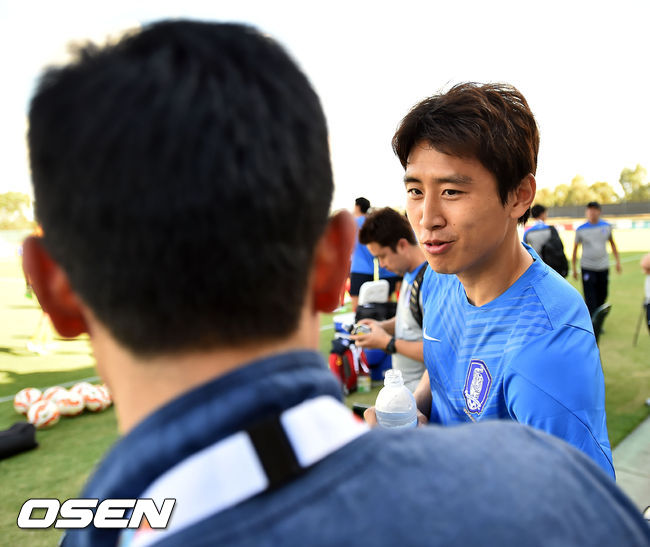 8일 오후 호주 캔버라 맥켈러 파크에서 열린 오만 축구대표팀 훈련때 구자철과 이영표 해설 위원과 즐겁게 얘기를 나누고 있다.