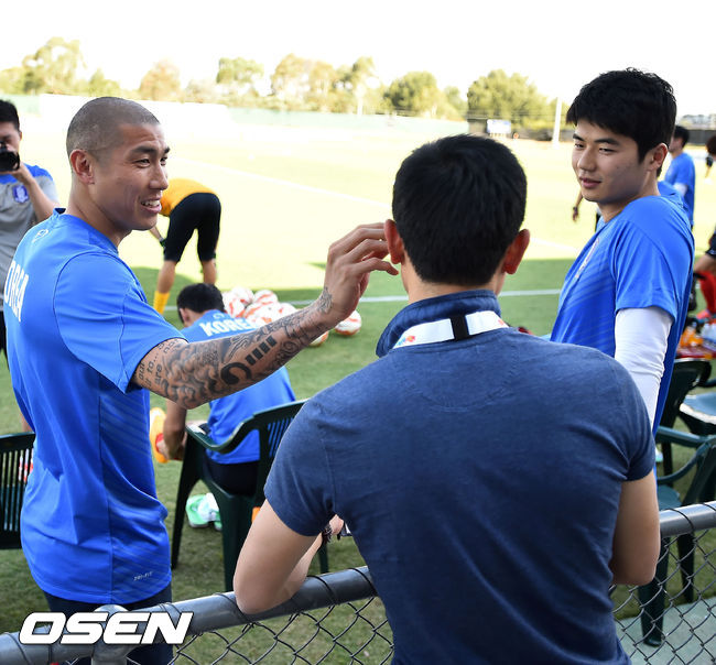 8일 오후 호주 캔버라 맥켈러 파크에서 열린 오만 축구대표팀 훈련때 이영표 해설위원과 차두리 기성용이 얘기를 나누고 있다.