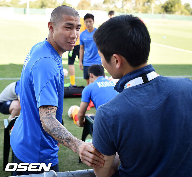 8일 오후 호주 캔버라 맥켈러 파크에서 열린 오만 축구대표팀 훈련때 차두리가 이영표 해설위원의 팔을 잡고 얘기를 하고 있다.
