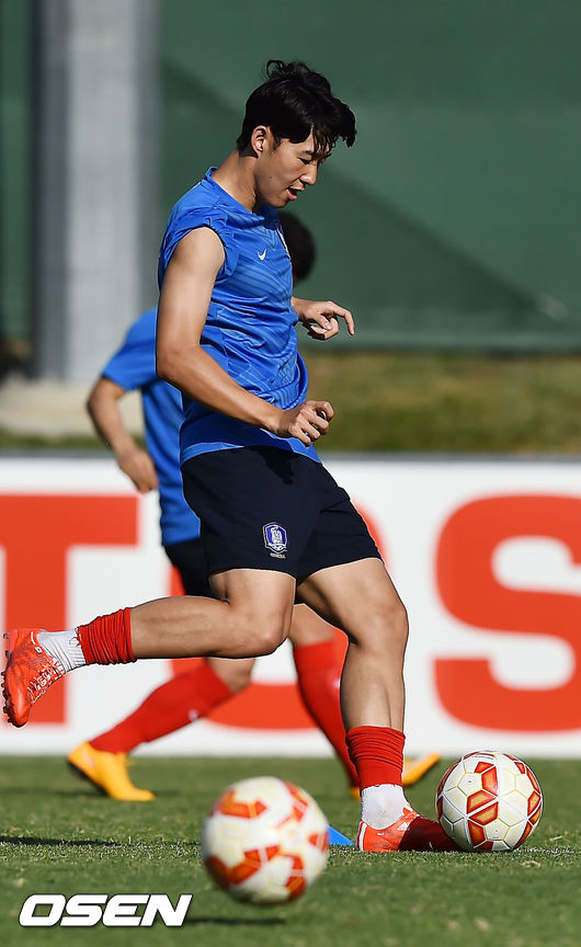 8일 오후 호주 캔버라 맥켈러 파크에서 열린 오만 축구대표팀 훈련때 손흥민이 패싱 훈련을 하고 있다.