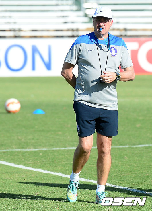 8일 오후 호주 캔버라 맥켈러 파크에서 열린 한국 축구대표팀 훈련때 슈틸리케 감독이 호루라기를 불고 있다.