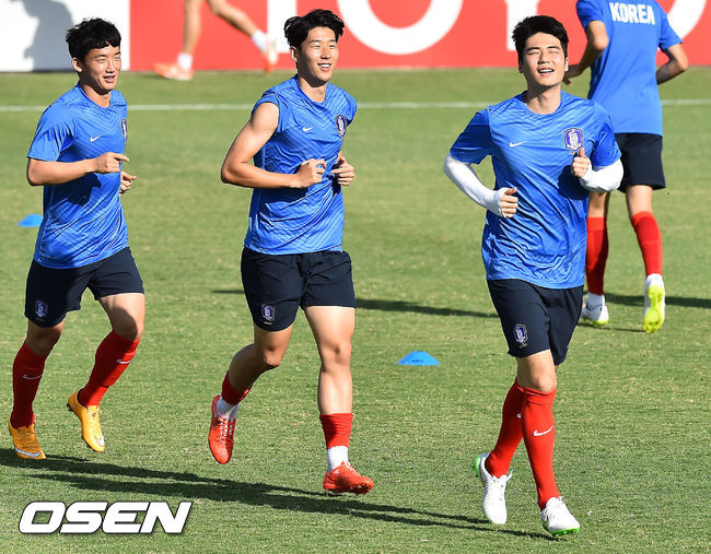 8일 오후 호주 캔버라 맥켈러 파크에서 열린 한국 축구대표팀 훈련때 김민우 손흥민 기성용이 달리고 있다.