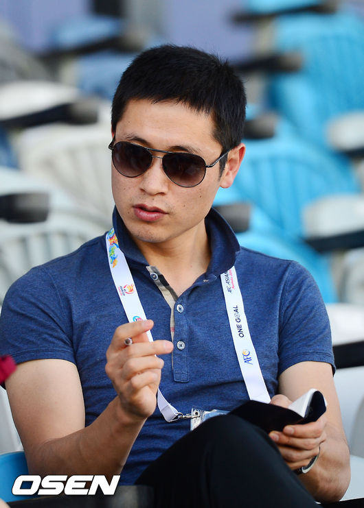 8일 오후 호주 캔버라 맥켈러 파크에서 열린 한국 축구대표팀 훈련때 이영표 해설위원이 선수들을 분석하고 있다.