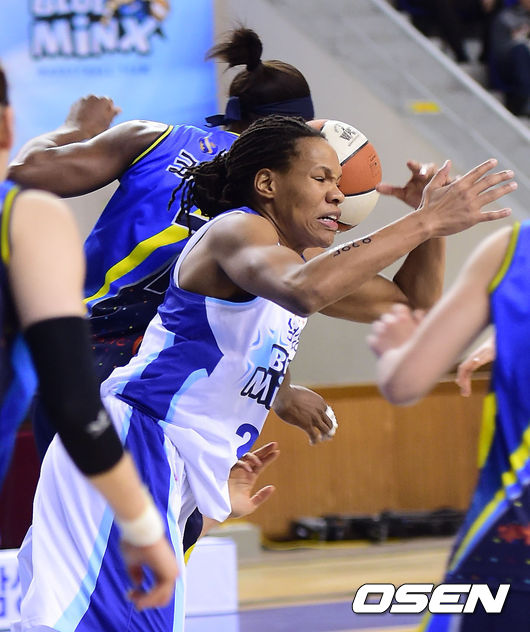 8일 오후 경기도 용인실내체육관에서 열린 'KB국민은행 2014-2015 여자프로농구' 용인 삼성과 인천 신한은행의 경기 3쿼터, 신한은행 크리스마스가 삼성 커리 볼을 슛블럭 하고 있다.