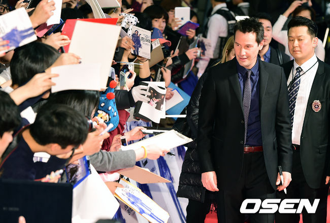 8일 오후 서울 코엑스 메가박스에서 진행된 영화 '존윅' 레드카펫 행사에서 배우 키아누 리브스가 팬들에게 사인을 해주고 있다.