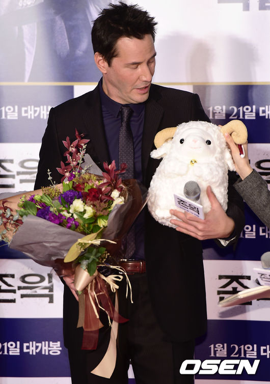 8일 오후 서울 삼성동 코엑스 몰 메가박스에서 열린 배우 키아누 리브스(Keanu Reeves)의 내한 레드카펫 행사에서 배우 키아누 리브스가 선물로 받은 양인형을 바라보고 있다.