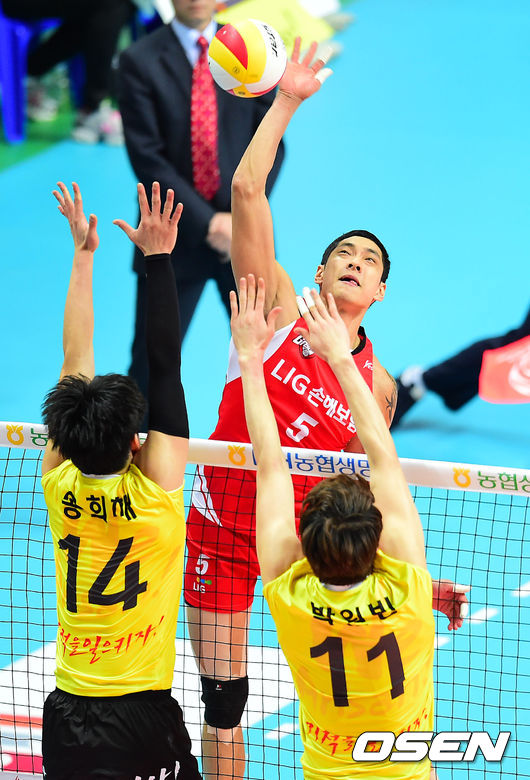 8일 오후 경기도 안산 상록수체육관에서 'NH농협 2014~2015 V-리그' 남자부 OK저축은행과 LIG손해보험의 경기가 열렸다.