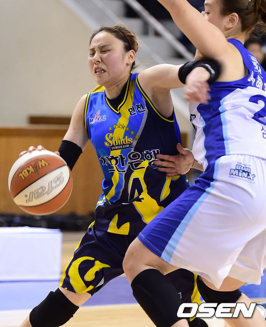 8일 오후 경기도 용인실내체육관에서 열린 'KB국민은행 2014-2015 여자프로농구' 용인 삼성과 인천 신한은행의 경기 3쿼터, 신한은행 최윤아가 삼성 배혜윤 수비를 뚫고 있다.