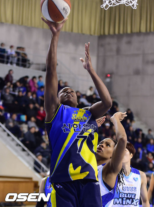8일 오후 경기도 용인실내체육관에서 열린 'KB국민은행 2014-2015 여자프로농구' 용인 삼성과 인천 신한은행의 경기 4쿼터, 신한은행 크리스마스가 골밑슛을 하고 있다.