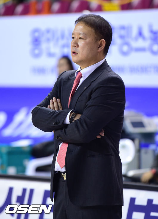 8일 오후 경기도 용인실내체육관에서 열린 'KB국민은행 2014-2015 여자프로농구' 용인 삼성과 인천 신한은행의 경기 3쿼터, 신한은행 정인교 감독이 경기를 지켜보고 있다.