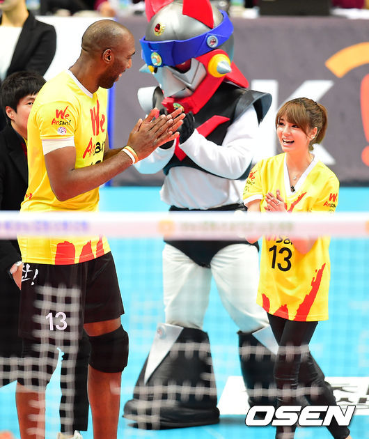 경기 시작을 앞두고 가수 샤넌이 시구를 마친 뒤 OK저축은행 시몬과 인사를 나누고 있다.