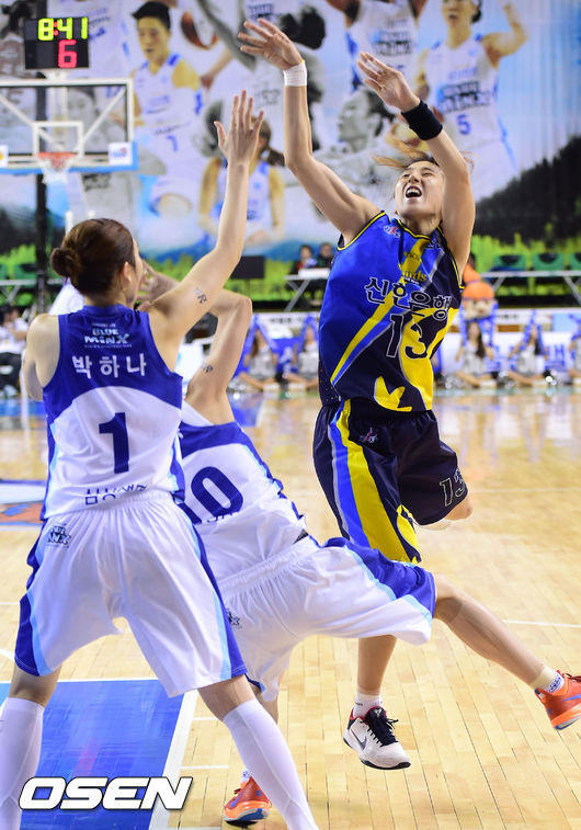 8일 오후 경기도 용인실내체육관에서 열린 'KB국민은행 2014-2015 여자프로농구' 용인 삼성과 인천 신한은행의 경기 3쿼터, 신한은행 김단비에게 삼성 고아라가 파울을 범하고 있다.