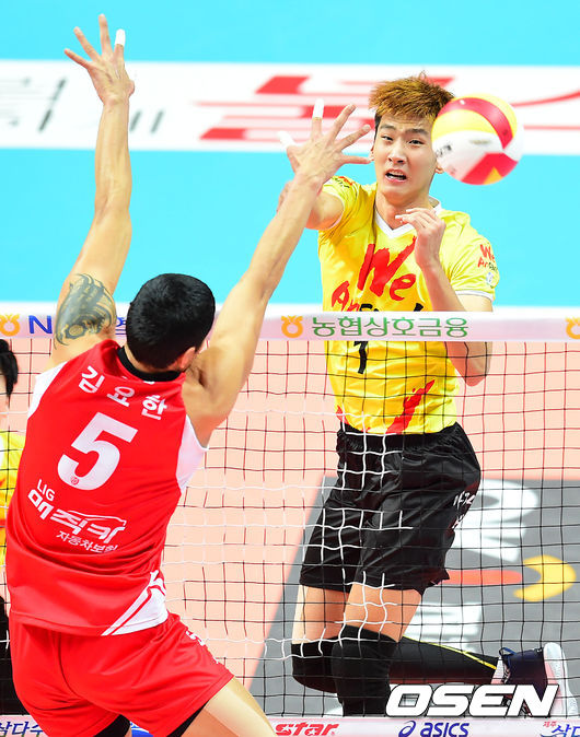 1세트, OK저축은행 송명근이 LIG 김요한의 블로킹을 받으며 공격을 시도하고 있다.