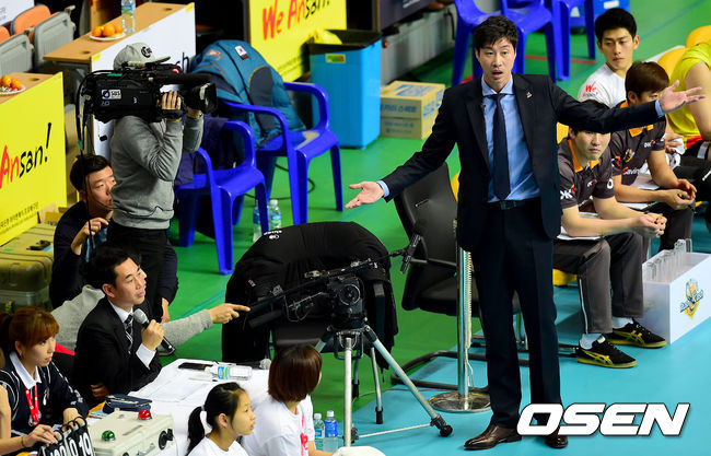 1세트, OK저축은행 김세진 감독이 비디오 판독 판정과 관련해 어필하고 있다.