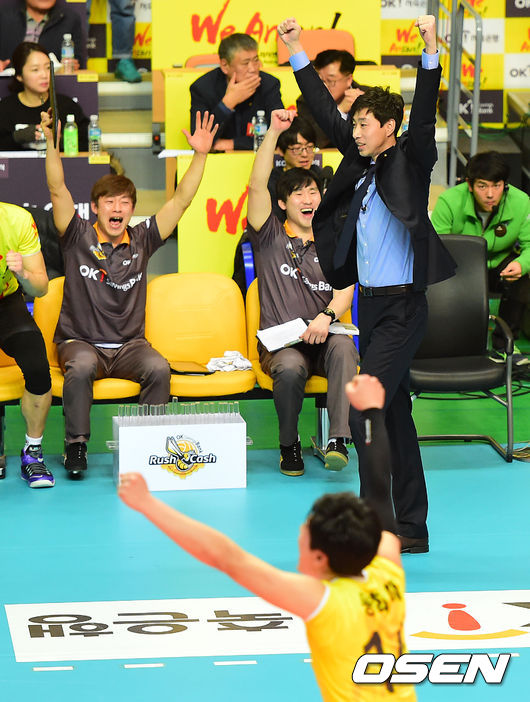 승리를 거둔 OK저축은행 김세진 감독이 두 팔을 번쩍 들며 환호하고 있다./dreamer@osen.co.kr