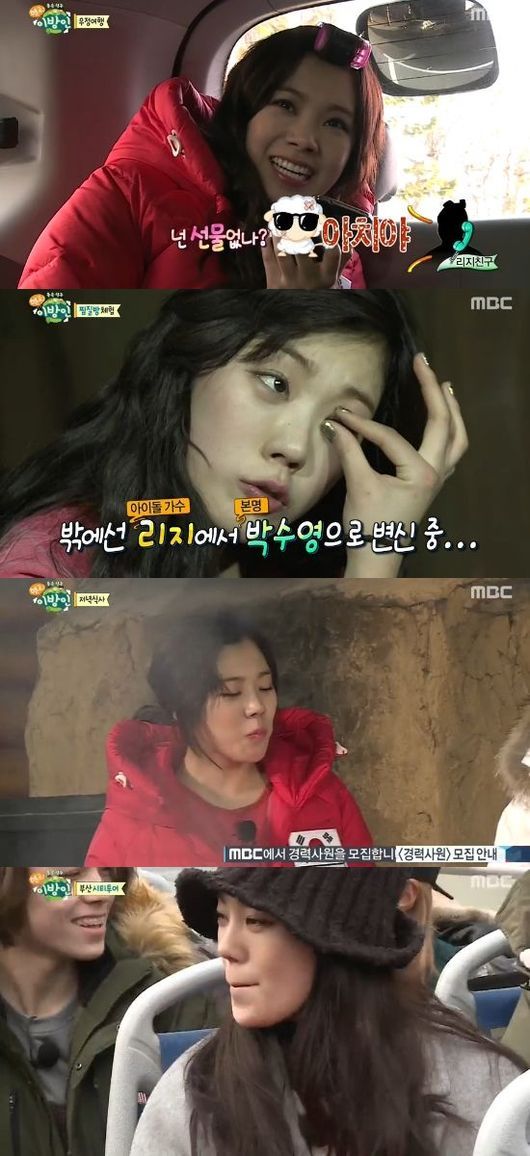 또한 리지는 이들 앞에서 아이돌이 마지막까지 지켜야할 메이크업도 훌훌 벗어버렸다. 찜질방을 찾은 리지는 더위에 힘들어하며 정성스럽게 붙인 속눈썹을 하나하나 떼어냈던 것. 찜질방에서 가장 먼저 나온 그는 "화장 지우면 안되냐"면서 곧장 이를 실행했다. 아이돌 리지에서 소탈한 박수영으로 돌아온 그는 회식비에 대한 질문에도 "소속사 대표님이 있다"며 능청스레 답했다.