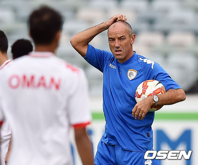9일 오후 호주 캔버라 스타디움서 열린 한국 축구대표팀과 오만 축구대표팀의 훈련에서 오만의 폴 르갱 감독이 생각에 잠겨있다.