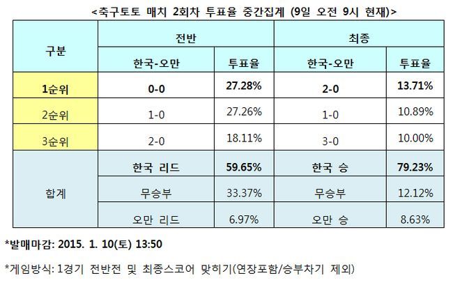2015 호주 아시안컵 한-오만전 대상 축구토토 매치 12회차 투표율 중간집계