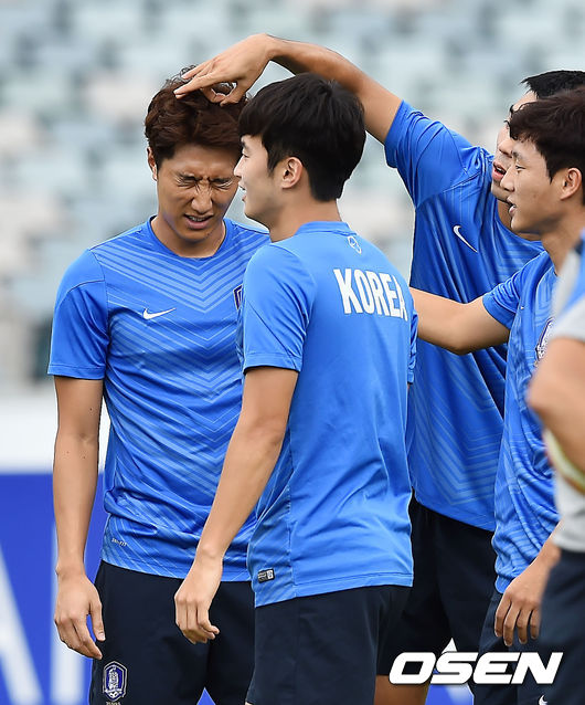 9일 오후 호주 캔버라 스타디움서 열린 한국 축구대표팀의 훈련때 조영철이 딱밤을 맞고 있다.