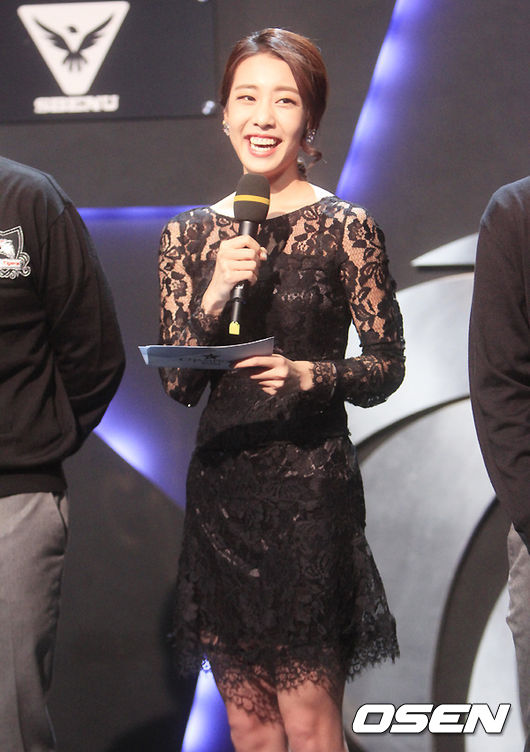9일 오후 서울 용산 온게임넷 e스포츠 상설경기장에서 '2015 LOL 챔피언스(이하 롤챔스)' 코리아 스프링 2회차 1경기 GE 타이거즈와 IM의 경기가 열렸다. '롤챔스 여신' 조은정 아나운서 1경기 승리팀 GE 선수들 인터뷰에 앞서 승리 축하 인사를 하고 있다.