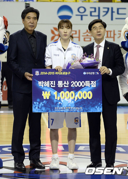 하프타임때 진행된 우리은행 박혜진 통산 2000득점을 기념 시상식에서 포토타임을 갖고 있다.