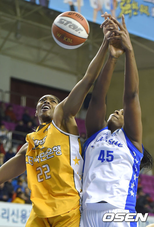 3쿼터 KB 스타즈 비키바흐오 우리은행 굿렛이 리바운드 다툼을 벌이고 있다.