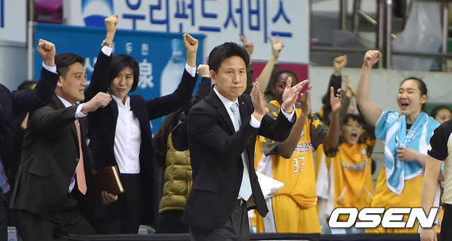 4쿼터 승리를 확신한 KB 스타즈 서동철 감독과 선수단이 기뻐하고 있다. / youngrae@osen.co.kr