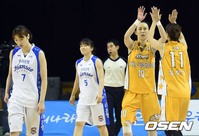 승리를 거둔 KB스타즈 변연하와 김보기가 하이파이브를 하고 있다. / youngrae@osen.co.kr