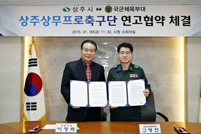 상주시(시장 이정백)와 국군체육부대(부대장 고명현)는 9일 상주시청 소회의실에서 상주 상무 프로축구단의 연고 협약을 체결, 계약을 2년간 연장했다.
