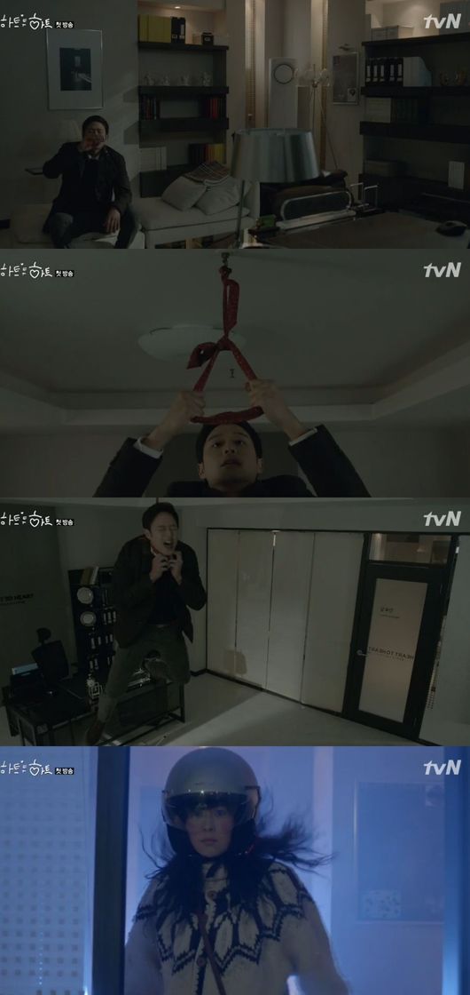 이석은 자동응답기로 그 이야기를 들으며 목을 멨던 줄에서 내려오려고 하지만, 의자가 넘어지며 줄에 목에 걸려 죽을 위기를 맞는다.