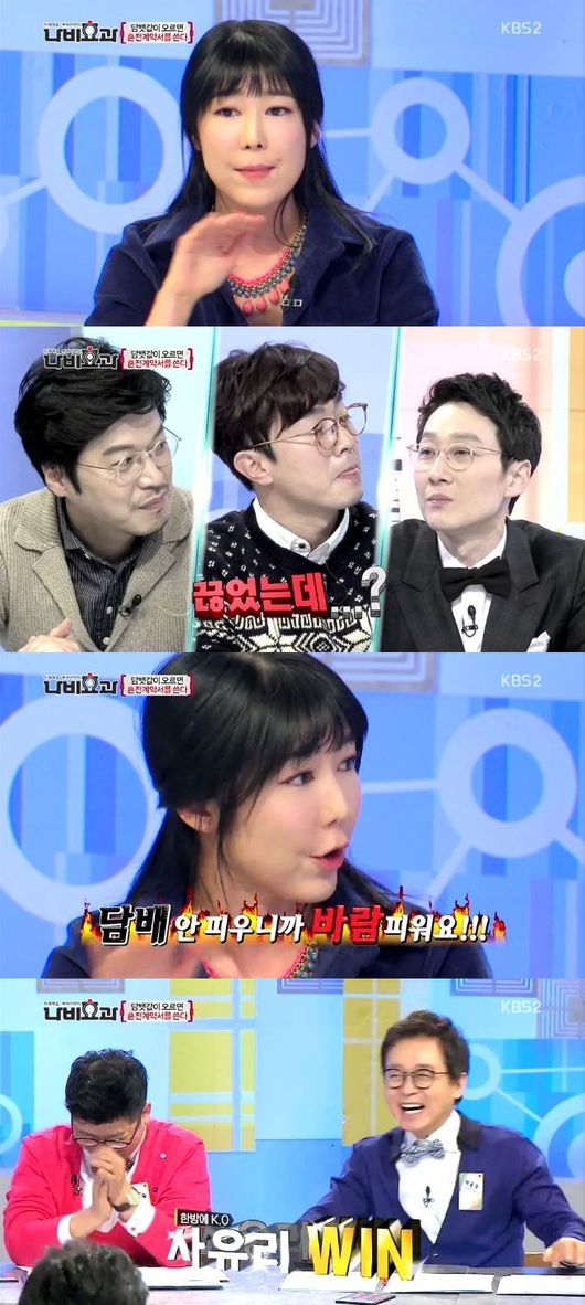 사유리는 9일 오후 방송된 KBS 2TV '미래예측 버라이어티 나비효과'(이하 '나비효과')에서 '담뱃값이 오르면 혼전계약서를 쓴다'는 예측에 대해 이야기를 나누던 중 "우리 아버지도 담뱃값이 올라서 끊었는데"라고 말문을 열었다.
