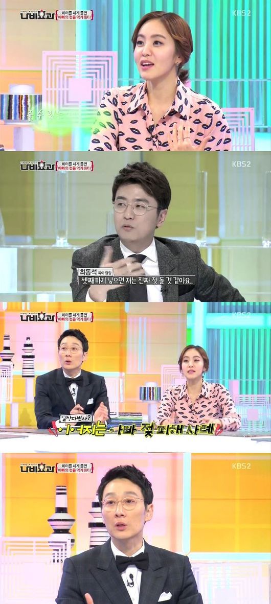 박지윤은 9일 오후 방송된 KBS 2TV '미래예측 버라이어티 나비효과'(이하 '나비효과')에서 '히터를 세게 틀면 아빠의 젖을 먹게 된다'는 예측에 대해 이야기를 하던 중 실제로 최동석 아나운서가 젖을 물려본 적이 있다고 말했다.