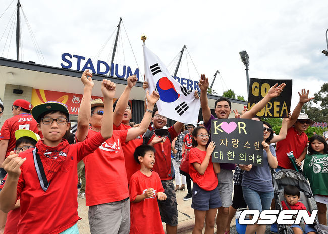 10일 오후(한국시간) 호주 캔버라 스타디움에서 '2015 AFC 아시안컵 조별리그 1차전' 한국-오만의 경기가 열릴 예정인 가운데 한인 팬들이 경기장 밖에서 응원을 하고 있다.