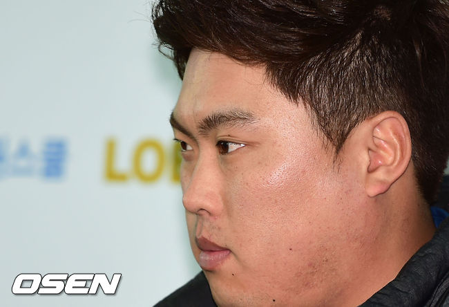 출국에 앞서 류현진이 기자회견을 하고 있다.