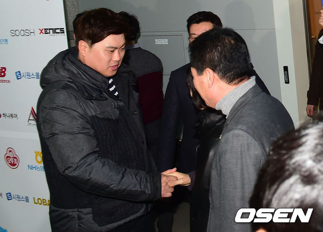 출국에 앞서 류현진이 아버지와 인사를 나누고 있다.