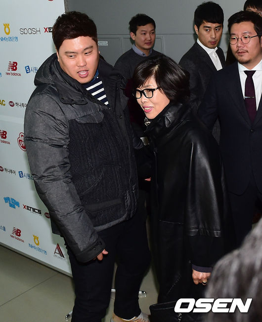 출국에 앞서 류현진이 어머니와 인사를 나누고 있다.