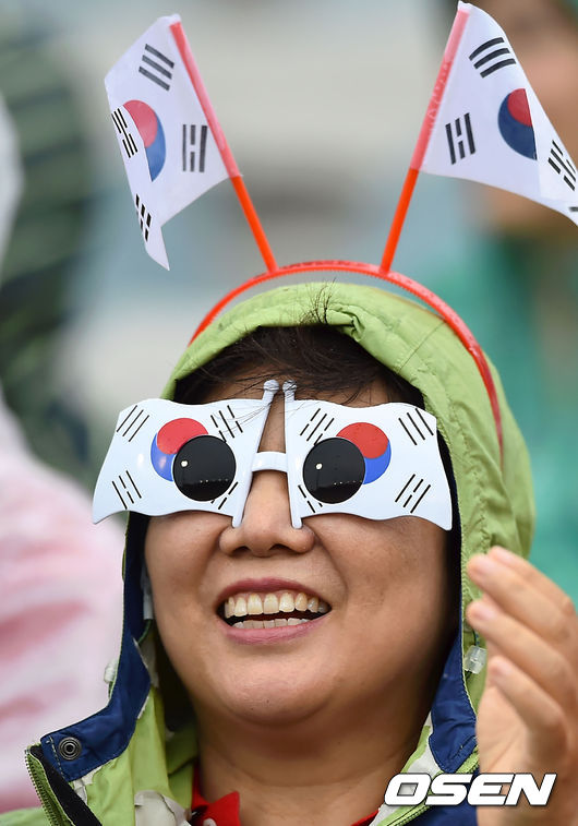 경기에 앞서 태극기 안경을 쓴 한국 축구팬이 응원을 펼치고 있다.