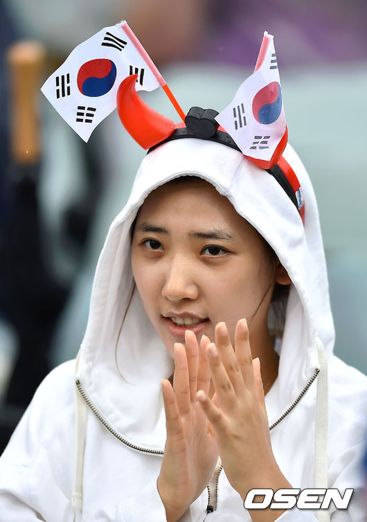 경기에 앞서 한국 축구팬이 응원을 펼치고 있다.