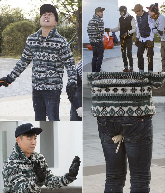 이는 복불복에 참여하고 있는 김종민의 모습이다. 녹화 당시 멤버들은 아침식사를 획득하기 위해 '엉덩이 차력' 대결을 펼치게 됐다. 멤버들은 각자 끈을 배정받고 엉덩이로 나무젓가락을 부러뜨리며 때묻지 않은 순수한 몸 개그로 웃음을 선사했다.