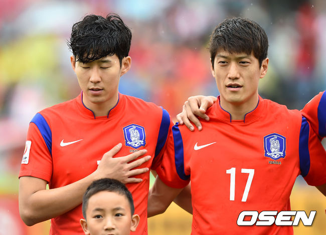 경기에 앞서 한국 손흥민과 이청용이 국민의례를 갖고 있다.