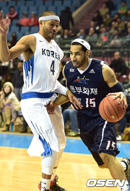 10일 오후 서울 잠실실내체육관서 열린 2014~15 KCC 프로농구 올스타전 첫날 KBL선발팀과 인천AG 국가대표팀의 경기,1쿼터 문태영과 문태종이 볼을 다투고 있다.
