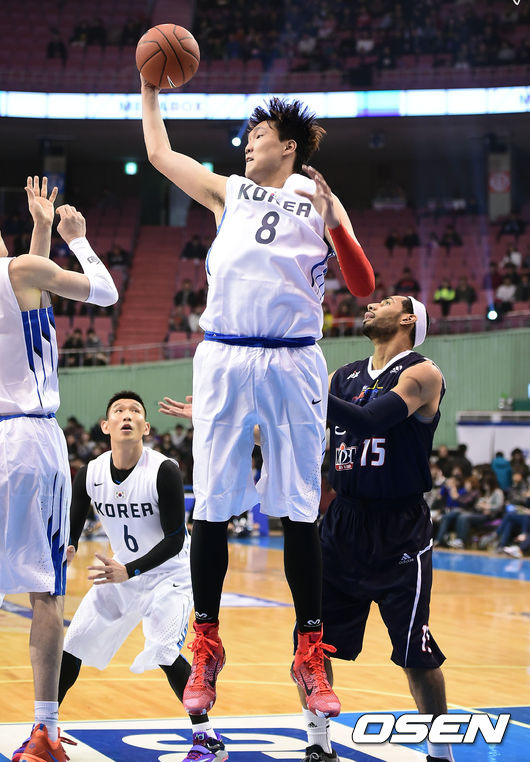 10일 오후 서울 잠실실내체육관서 열린 2014~15 KCC 프로농구 올스타전 첫날 KBL선발팀과 인천AG 국가대표팀의 경기,1쿼터 이종현이 리바운드를 하고 있다