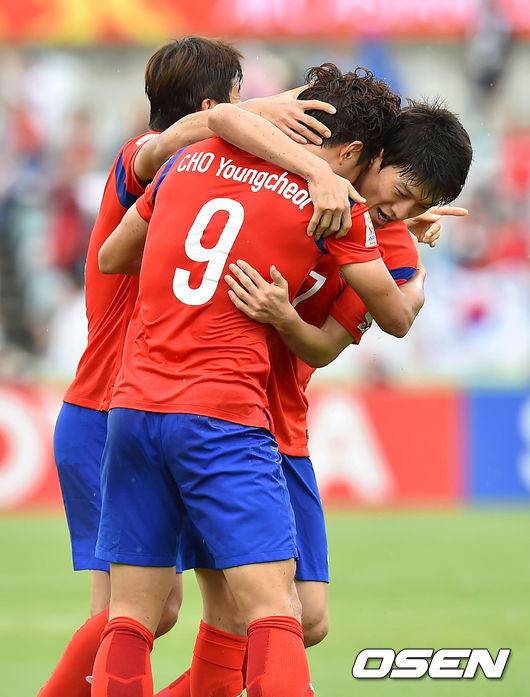 전반 한국 조영철이 선제골을 성공시키고 동료들과 환호하고 있다.